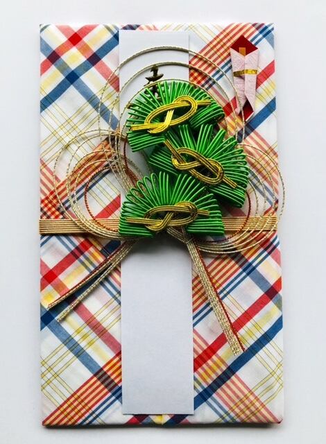 兵庫県の先染め織物「播州織」ハンカチに長野の水引きを結んだ祝儀袋です。